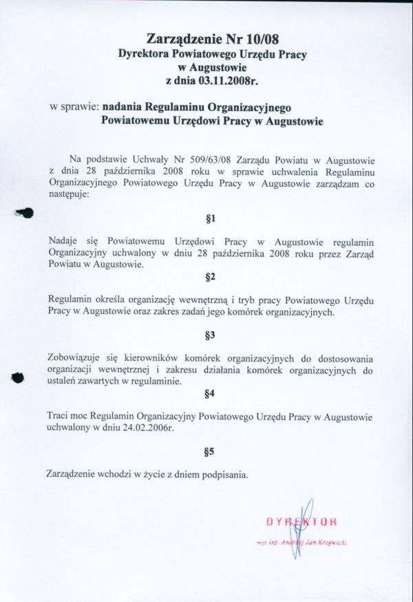 - Zarządzenie Nr 10/08 Dyrektora Powiatowego Urzędu Pracy w Augustowie z dnia 03 listopada 2008 roku w sprawie nadania Regulaminu Organizacyjnego Powiatowego Urzędu Pracy w Augustowie.