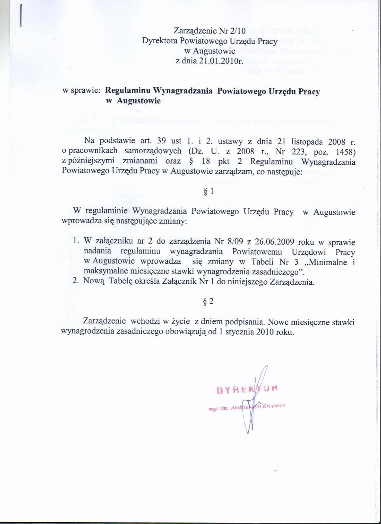 - Zarządzenie Nr 2/2010 Dyrektora Powiatowego Urzędu Pracy w Augustowie w sprawie Regulaminu Wynagradzania Powiatowego Urzędu Pracy w Augustowie