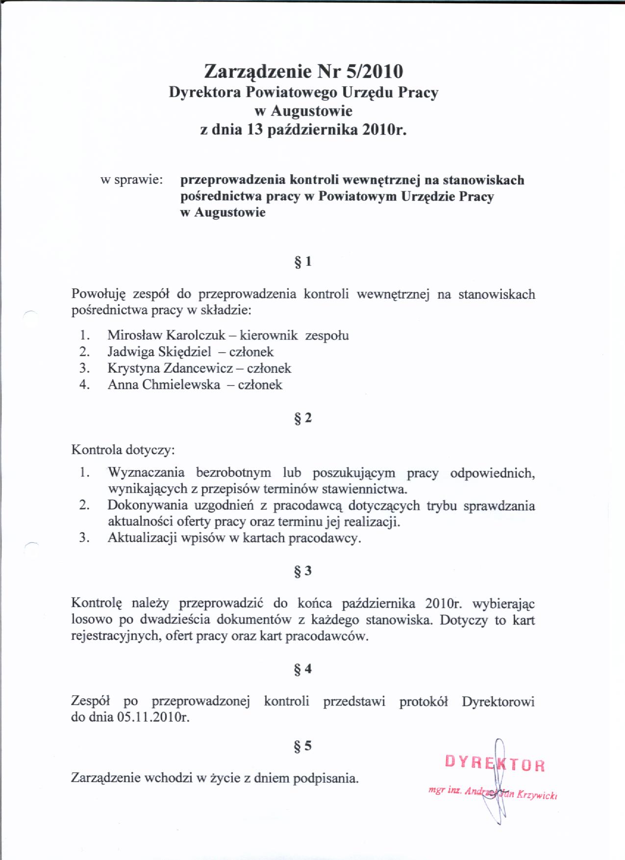 - Zarządzenie Nr 5/2010 Dyrektora Powiatowego Urzędu Pracy w Augustowie z dnia 13 października 2010 r. w sprawie przeprowadzenia kontroli wewnętrznej na stanowiskach pośrednictwa pracy w Powiatowym Urzędzie Pracy w Augustowie