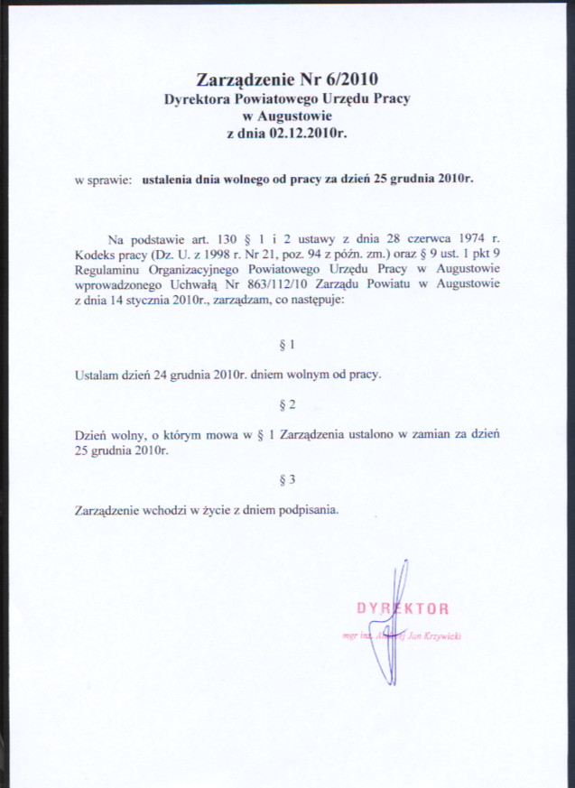 - Zarządzenie Nr 6/2010 Dyrektora Powiatowego Urzędu Pracy w Augustowie z dnia 02 grudnia 2010r. w sprawie ustalenia dnia wolnego od pracy za dzień 25 grudnia 2010r.