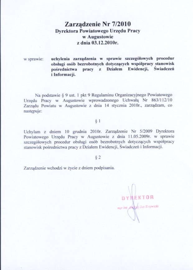 - Zarządzenie Nr7/2010 Dyrektora Powiatowego Urzędu Pracy w Augustowie z dniqa 03.12.2010r. w sprawie uchylenia zarządzenia w sprawie szczegółowych procedur obsługi osób bezrobotnych dotyczących współpracy stanowisk pośrednictwa pracy z Działem Ewidencji Świadczeń i Informacji.