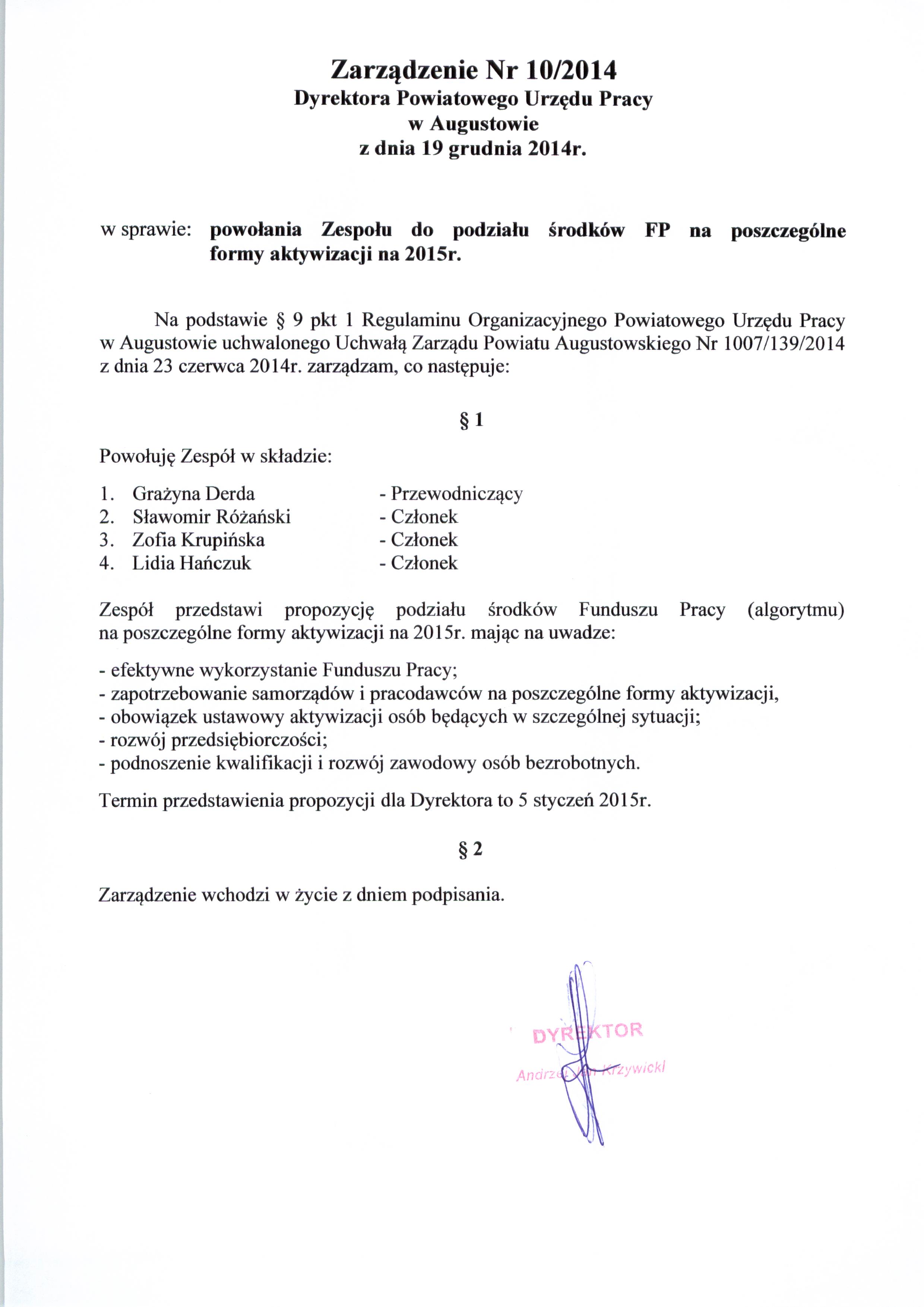 Zarządzenie Nr 10/2014