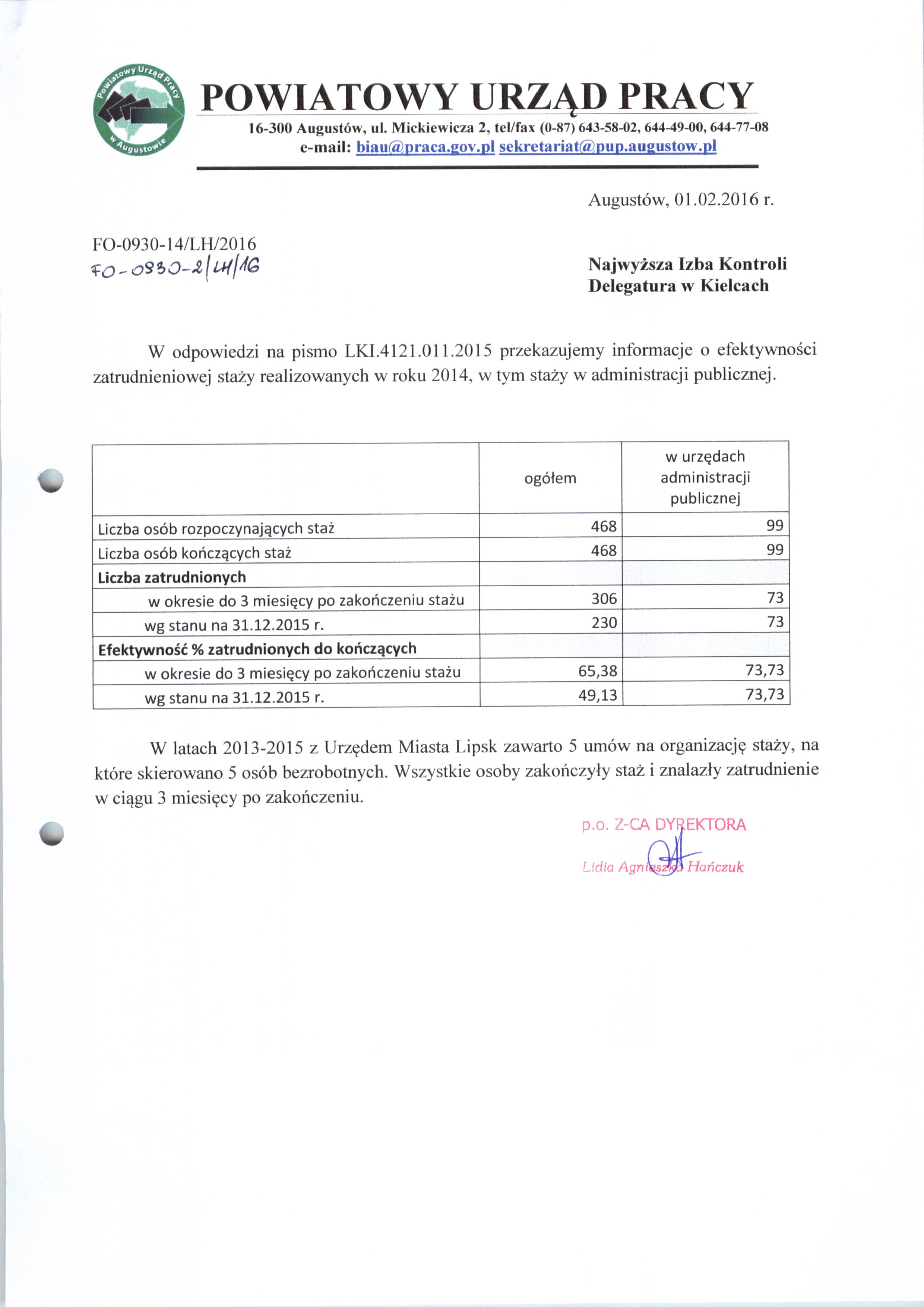 Przekazano na prośbę Najwyższej Izby Kontroli - Delegatury w Kielcach z dnia 12 stycznia 2016 r. informacje dotyczące realizacji staży.